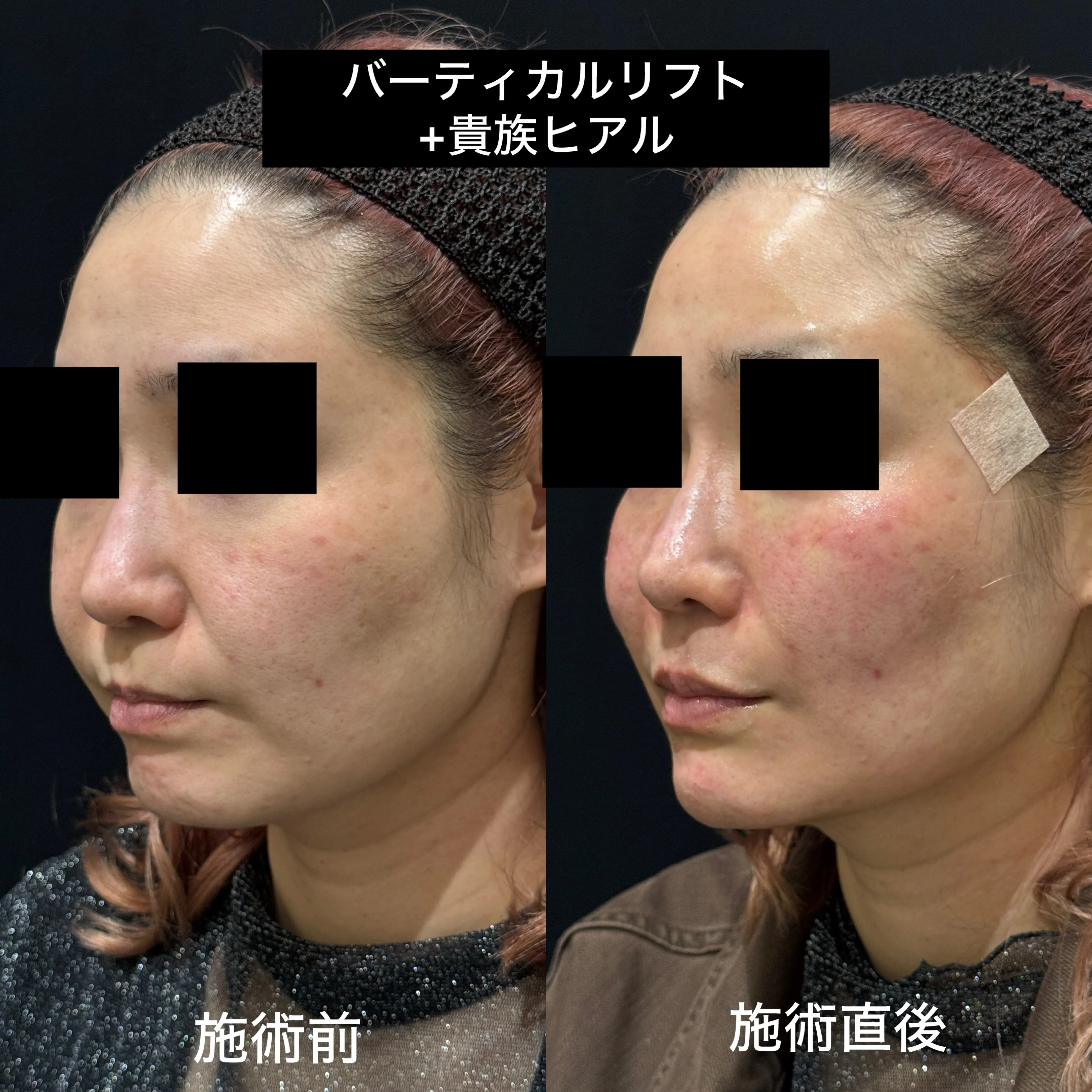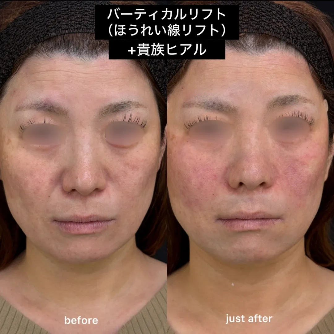 「重力に沿って下がったほうれい線を、真上に引き上げるバーティカルリフト。貴族ヒアルロン酸との組み合わせで、内側からふっくらとした立体感を実現。まるで時間を巻き戻したような、自然な若々しさを取り戻しました。」
